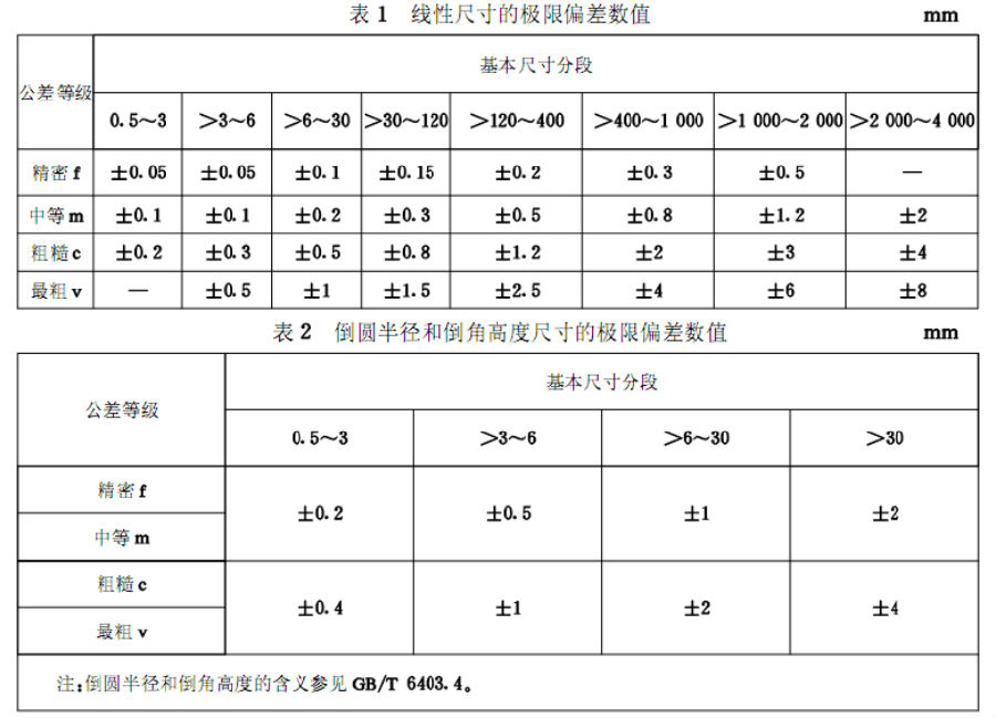 一般來(lái)說(shuō),公差分為精密f、中等m、粗糙c、最粗v共4個(gè)公差等級(jí),在精密機(jī)械加工當(dāng)中,我們經(jīng)常參考的一般是精密f級(jí)和中等m級(jí)較多;未注的線性尺寸和角度尺寸分別給出了公差等級(jí)的極限偏差數(shù)值供我們參考: